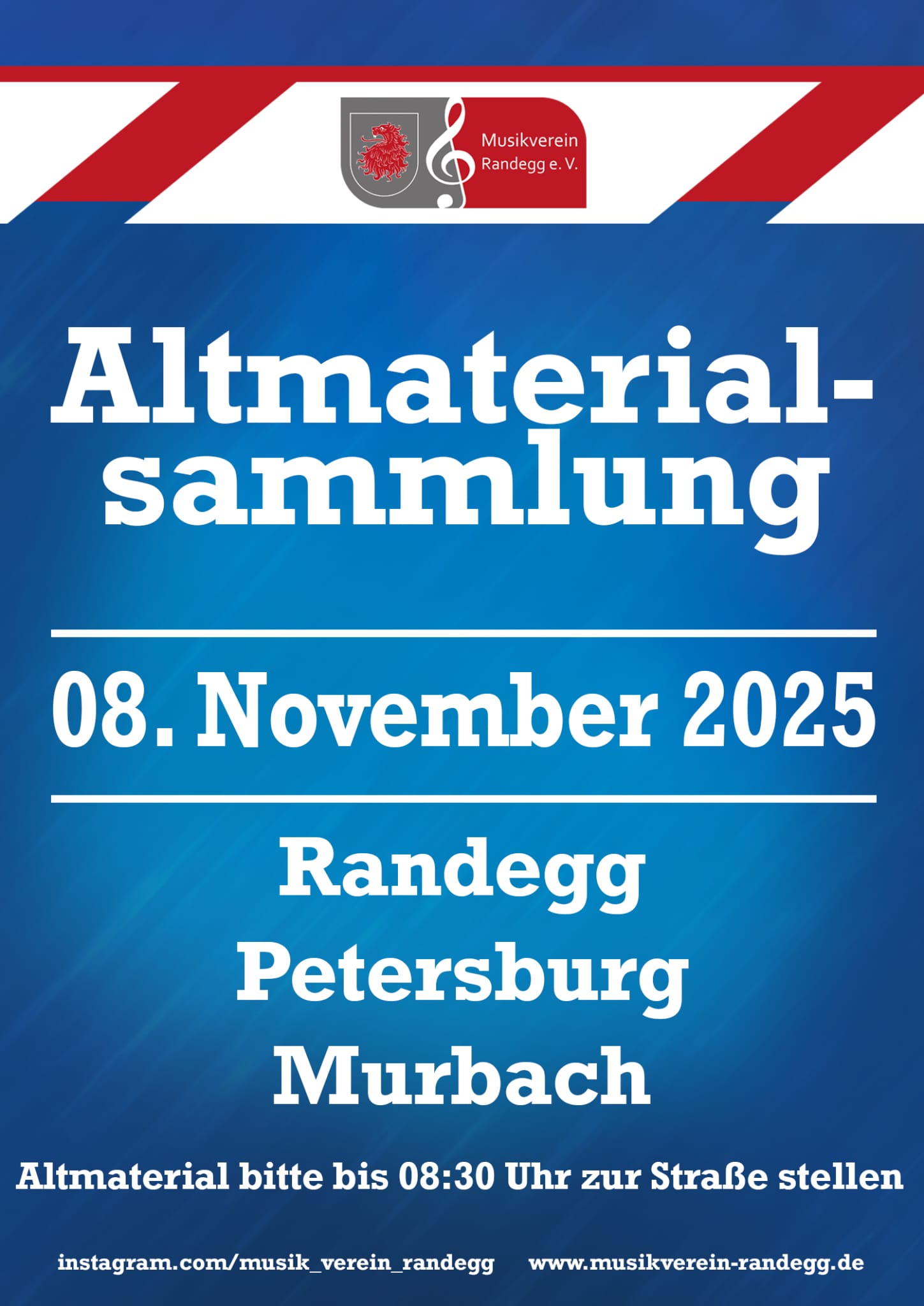 Am Samstag, den 08. November 2025 sammeln wir wieder Altmetall in Randegg, Petersburg und Murbach. Bitte stellen Sie Ihr Altmaterial erst am Tag der Sammlung morgens bis 8:30 Uhr an die Straße.