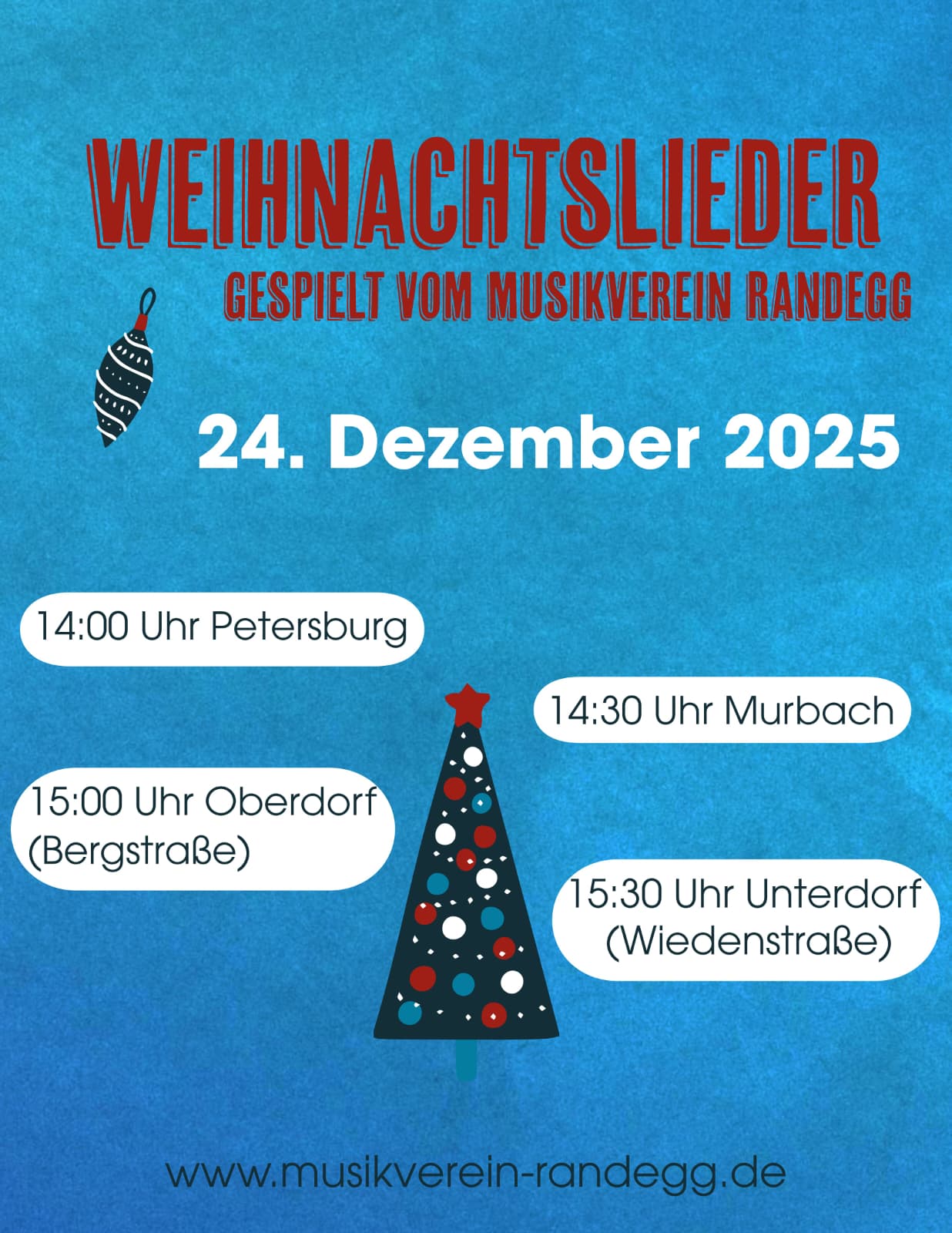 Am Heiligabend, den 24. Dezember 2025 spielen wir in gewohnter Weise wieder Weihnachtslieder in Petersburg (14 Uhr), Murbach (14:30 Uhr), Randegg Oberdorf/Bergstraße (15 Uhr) und Randegg Unterdorf/Wiedenstraße (15:30 Uhr). Wir freuen uns, Sie wieder auf die Feiertage einzustimmen und wünschen Ihnen besinnliche Festtage und einen guten Start in 2026!